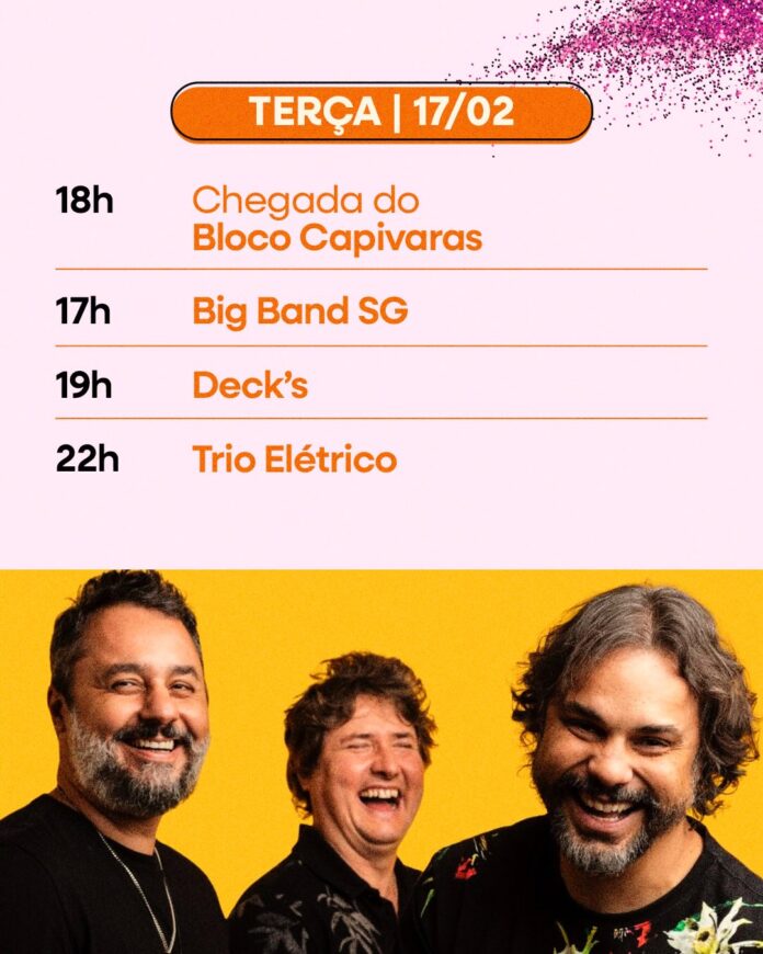 A programação conta com apresentação da Big Band SG, além da chegada do Bloco Capivaras, do Deck’s e do grupo Trio Elétrico, atrações que devem movimentar o público e encerrar a folia em clima de alegria. A expectativa é de grande participação popular, repetindo o sucesso dos dias anteriores de Carnaval no município.